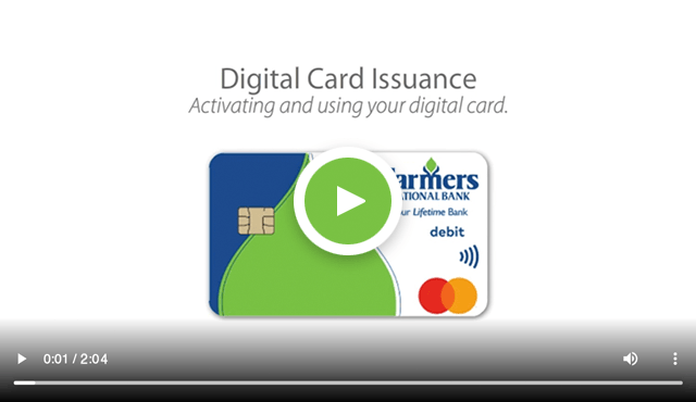 For new customers or existing customers receiving new debit cards, you do not have to wait for your physical Farmers National Bank debit card to start making purchases. We can send you a digital version of your card so you can start using it right away — either by adding to the digital wallet on your smartphone or for online purchases. We have a secure setup process, and this is another great way we make banking more convenient for you!